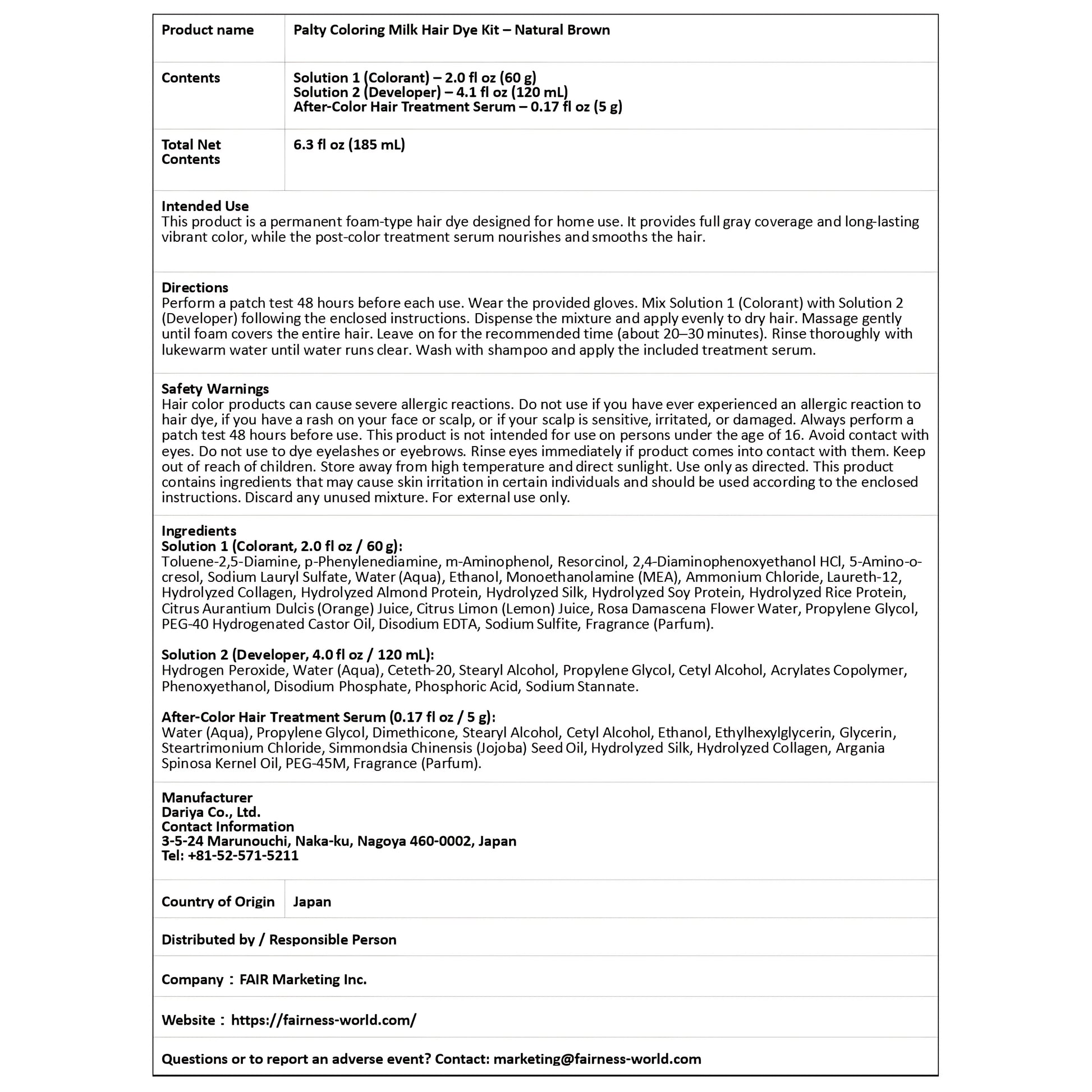 Palty Coloring Milk Hair Dye Kit – Natural Brown Japanese Hair Dye Made in Japan