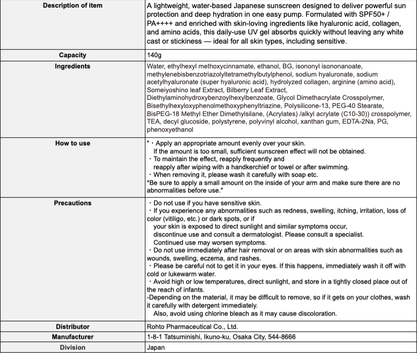 A lightweight, water-based Japanese sunscreen designed to deliver powerful sun protection and deep hydration in one easy pump. Formulated with SPF50+ / PA++++ and enriched with skin-loving ingredients like hyaluronic acid, collagen, and amino acids, this daily-use UV gel absorbs quickly without leaving any white cast or stickiness — ideal for all skin types, including sensitive.