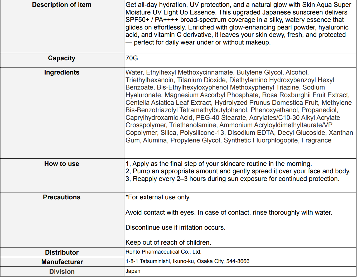 ☀️ Skin Aqua Super Moisture UV Light Up Essence– 70g