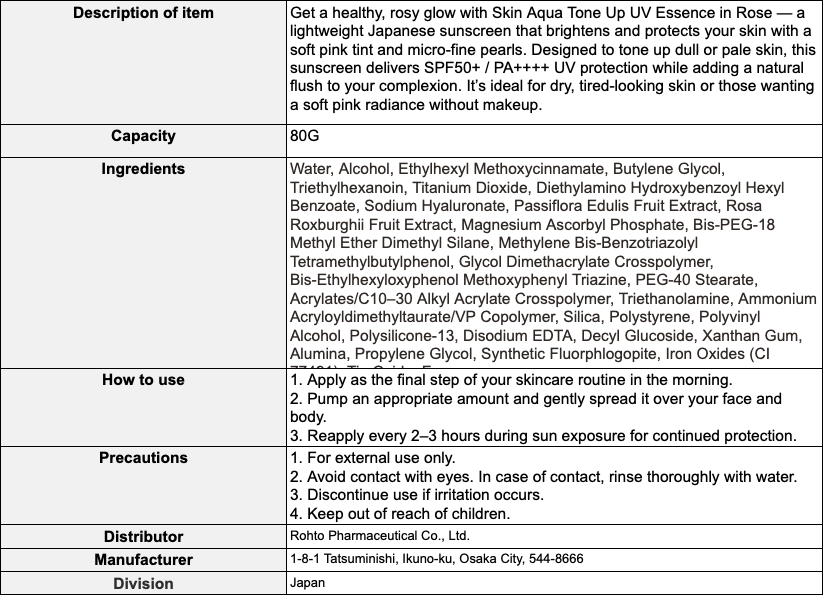Get a healthy, rosy glow with Skin Aqua Tone Up UV Essence in Rose — a lightweight Japanese sunscreen that brightens and protects your skin with a soft pink tint and micro-fine pearls. Designed to tone up dull or pale skin, this sunscreen delivers SPF50+ / PA++++ UV protection while adding a natural flush to your complexion. It’s ideal for dry, tired-looking skin or those wanting a soft pink radiance without makeup.